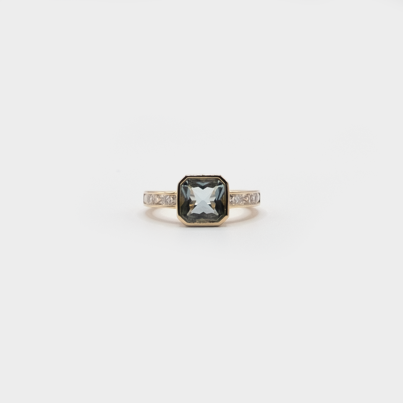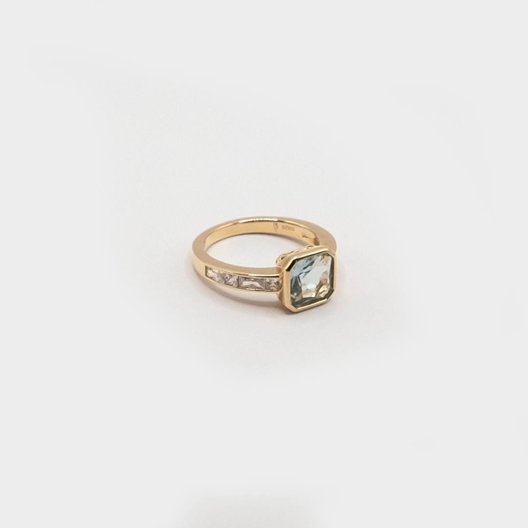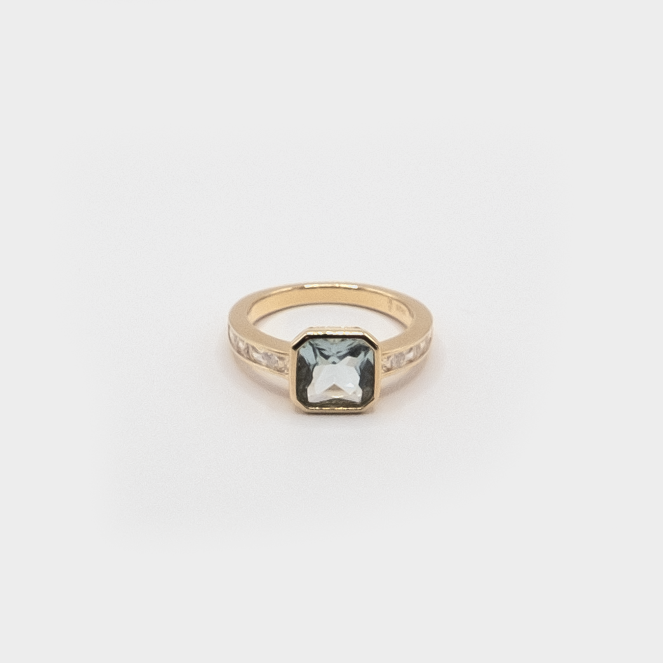 The L'Amore ring is a unique twist on the perfect engagement ring. A beautiful solitaire aquamarine stone sits on an eternity band adorned with zirconia stones.
