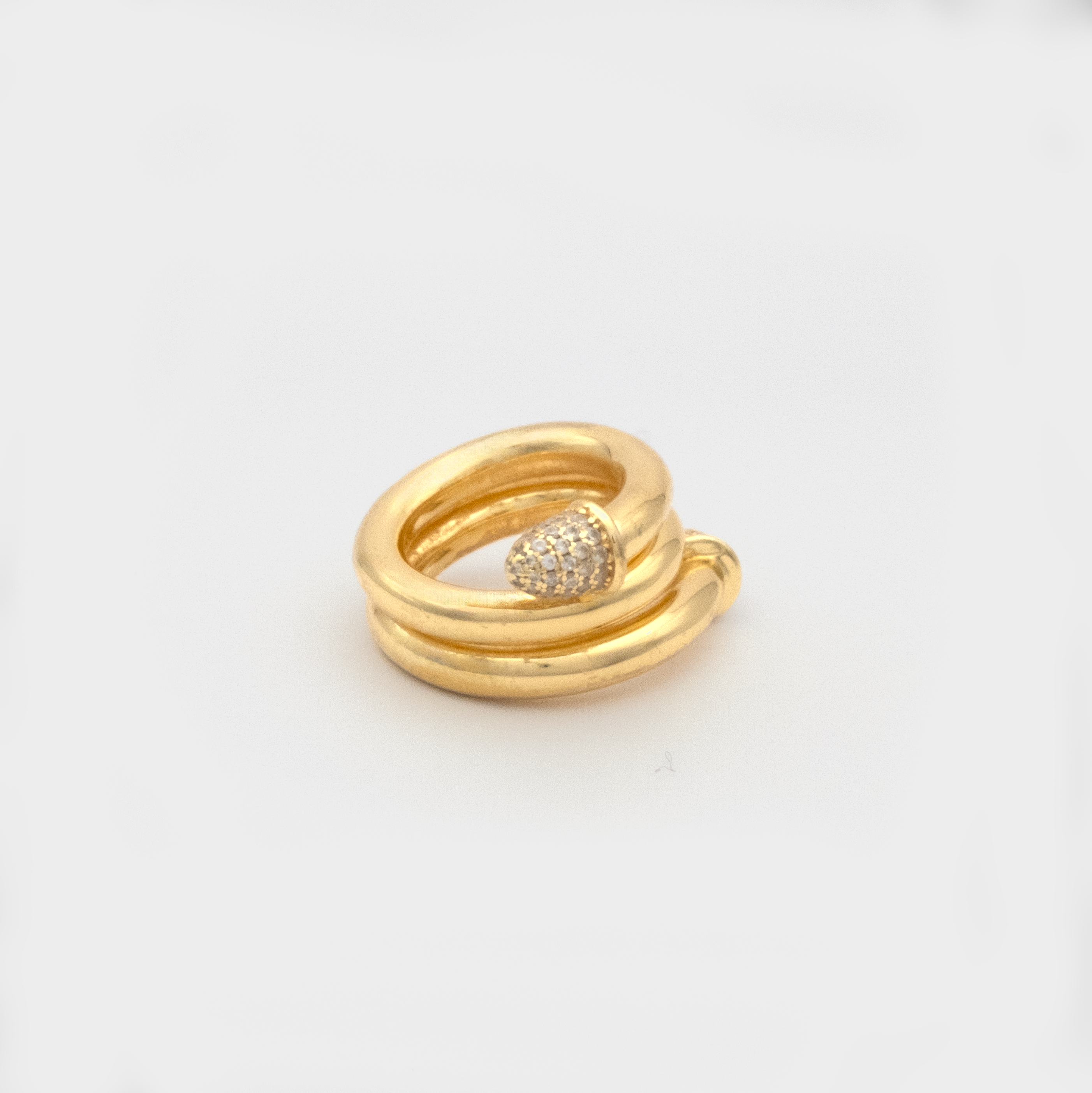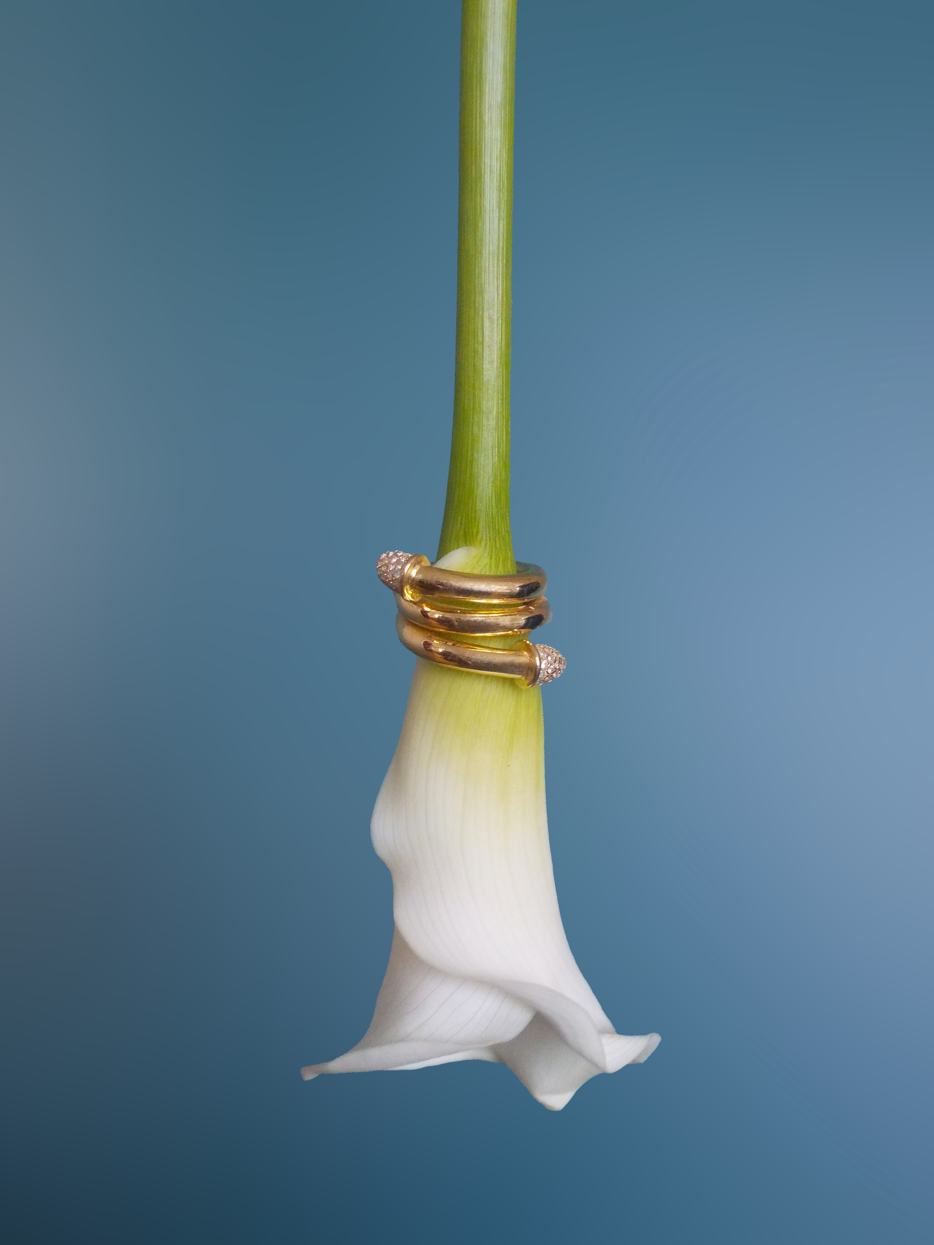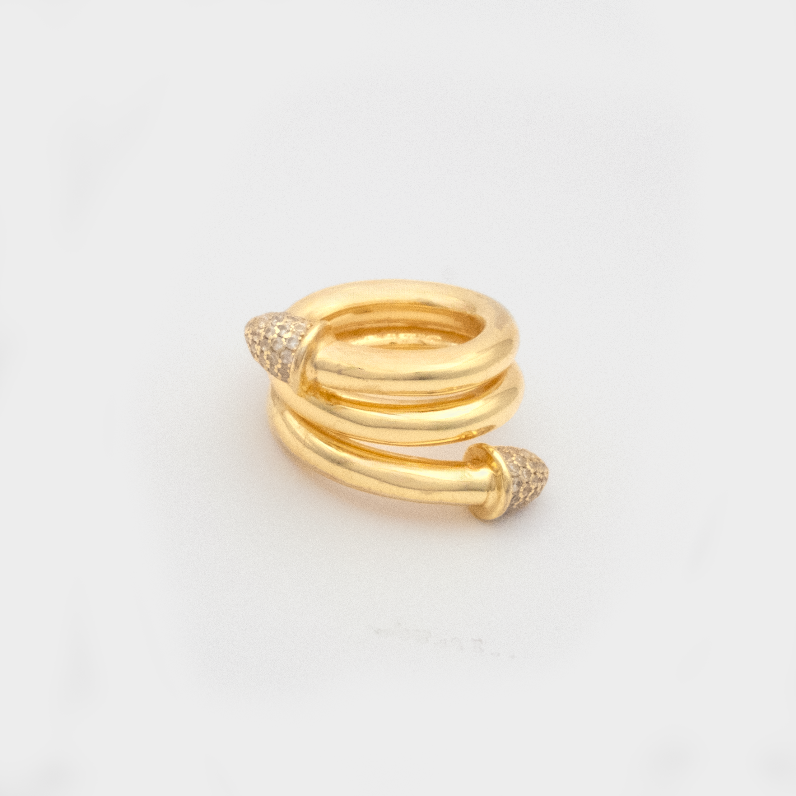 The Spirale Ring is a unique tubular wrap ring with pavé end caps at either end. A statement ring all on its own.